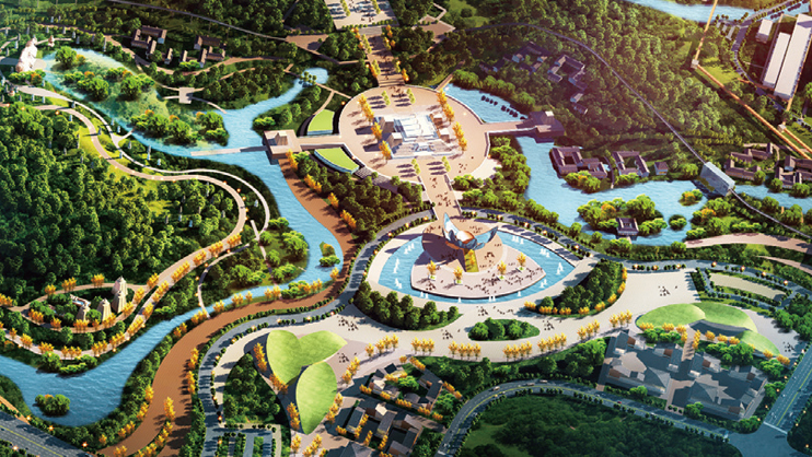 采取龙头带动,山-河-江全景式产业联动发展的全新途径,通过资源重整、奇迹再造、多轴融汇、山水联动、产业集聚五大思路,打造为国家AAAAA级旅游区、国家级文化产业示范区。突破佛教景区单一轴线的格局束缚,采用一心一环多轴的结构。以凤翔峰上国内最大坐佛为视觉核心,贯通的河道为环带,五条新旧共融的轴线交汇于一心。